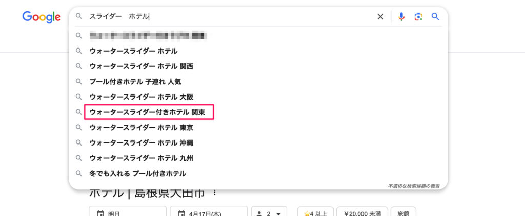 実際にGoogleで検索を使うと、地域違いで検索されているホテル紹介系キーワードはよく見つかりますよ♪