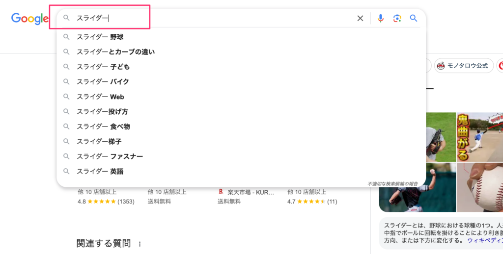 まずは、Google検索で「スライダー」と入力してみます。