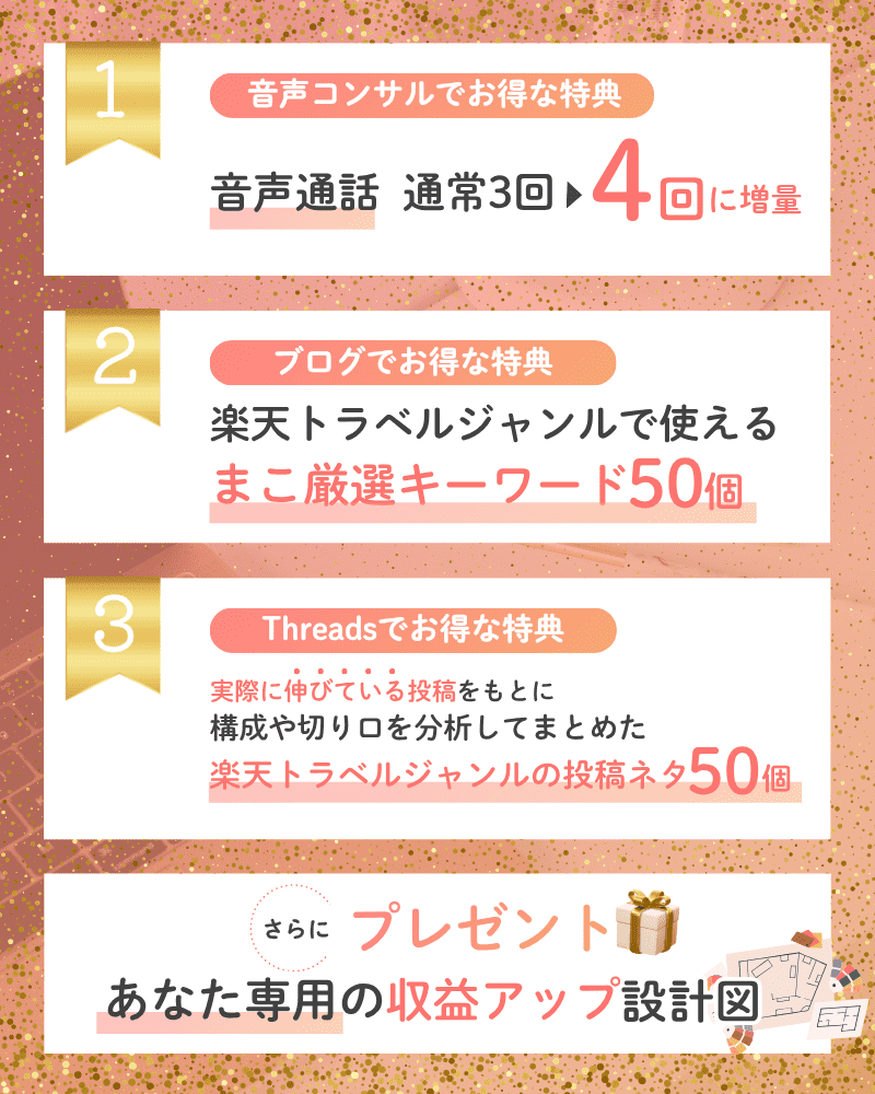 たとえば、ブログ教材「ワントップ」をお持ちの方にはブログに活かせる形で、スレッズ教材「Threads×楽天アフィリエイトの攻略本」をお持ちの方にはスレッズに合わせて、楽天トラベルのノウハウをお伝えしていきます。